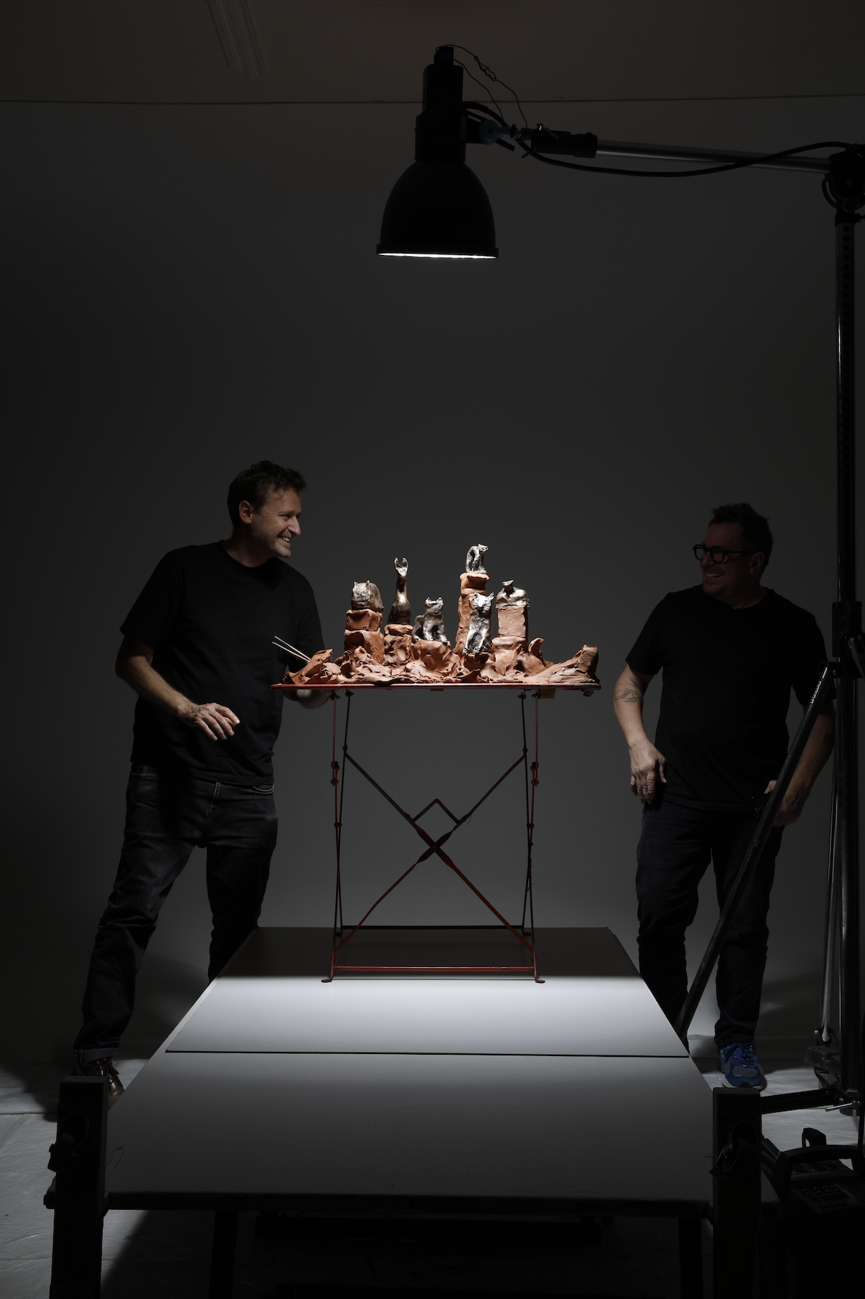 Wir arbeiten mit Neon, Fotografie und schaffen Skulpturen in verschiedensten Materialien – von Glas und Bronze bis zu Assemblagen aus gefundenen Objekten, wie in unserer Serie Portrait of a Friend.