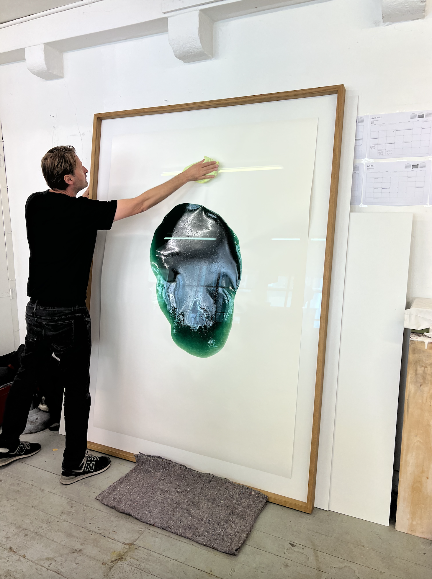 Ein besonderer Schwerpunkt unserer Arbeit ist Paradise Now: eine fortlaufende Serie abstrakter Malerei, bei der wir Polyesterharz auf Papier giessen und dem Zufall Raum geben. Was 2010 begann, entwickeln wir bis heute stetig weiter – ein Prozess, der uns immer wieder von Neuem fordert.